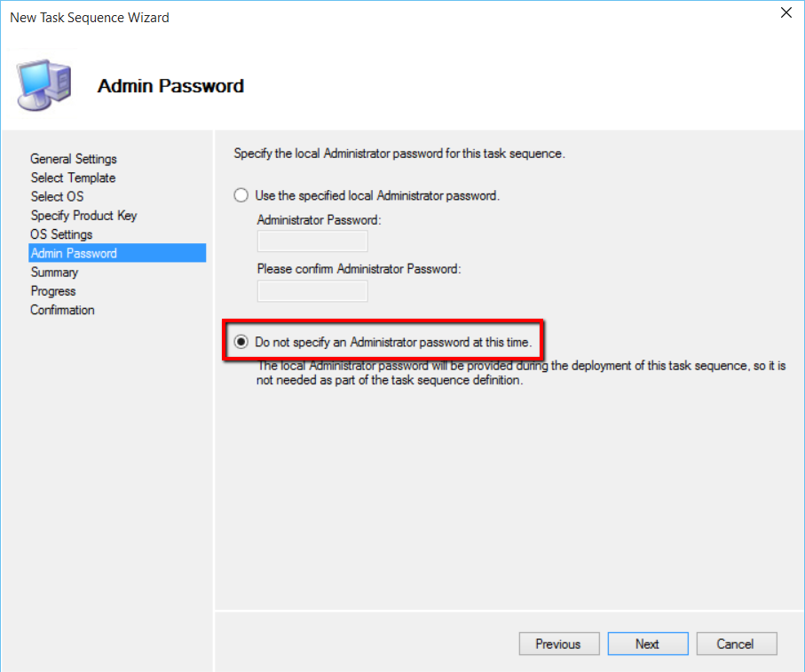 Enter a Admin Password or choose “Do not specify an Administrator password at this time”