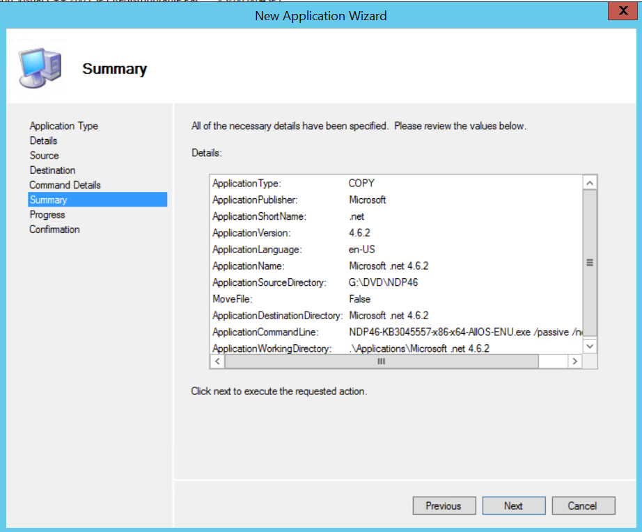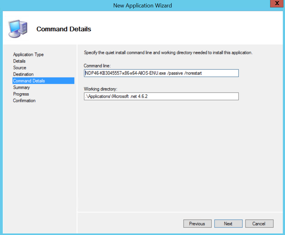 Enter the silent install command for .net 4.6 : NDP46-KB3045557-x86-x64-AllOS-ENU.exe /passive /norestart