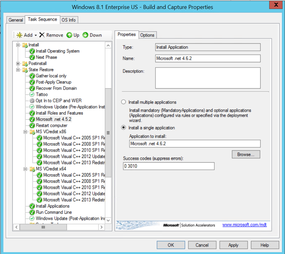 Go to you “Build and Capture” Task Sequence and enter the application just created and a restart action just after