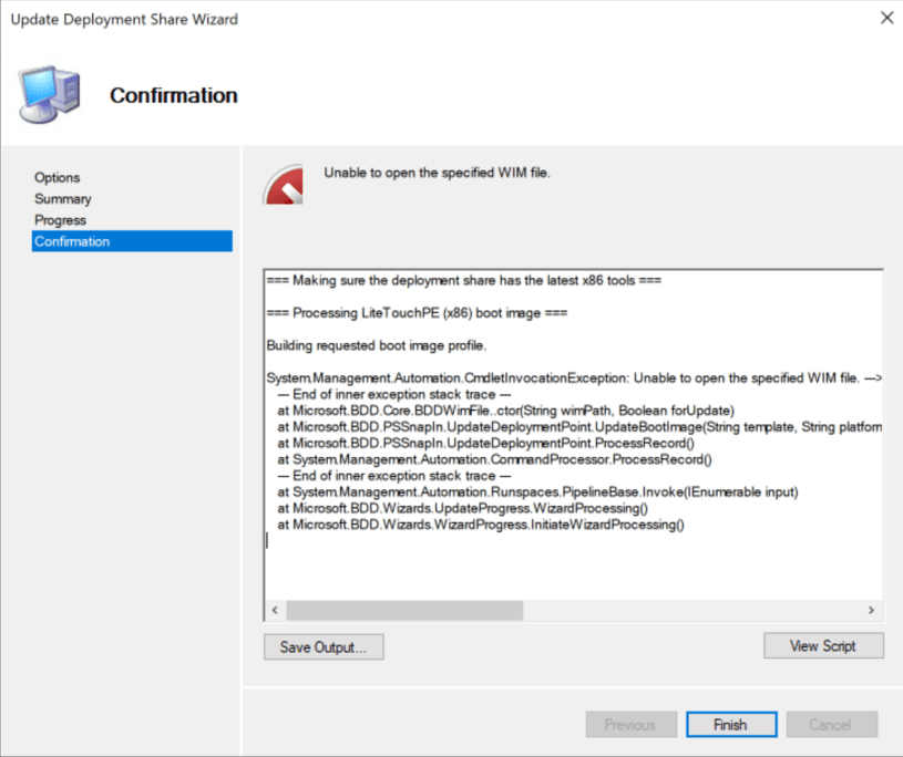 System.Management.Automation.CmdletInvocationException: Unable to open the specified WIM file. —> System.Exception: Unable to open the specified WIM file. —> System.ComponentModel.Win32Exception: The system cannot find the path specified
