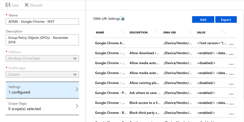 I have also created 2 powershell script to Create a Intune Windows 10 Custom policy profile that create all the setting in the Google Chrome ADMX based policies from STIG – it can be downloaded from my Github page there is two import file: