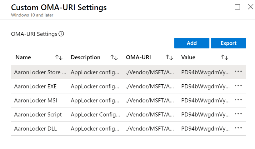 - OMA-URI : ./Vendor/MSFT/AppLocker/ApplicationLaunchRestrictions/StoreAppsGroup/StoreApps/Policy