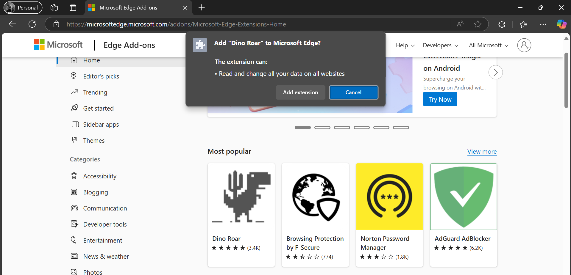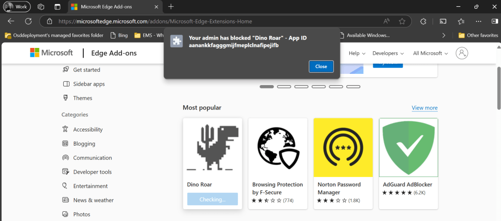 As the policy is a device policy you would expect it to apply to everything on the device – so lets try to sign into Microsoft Edge with a personal account (MSA) – now you are allowed to install the same browser extension “Dino Roar” that you where blocked from installing with your profile signed in with your Entra ID.
