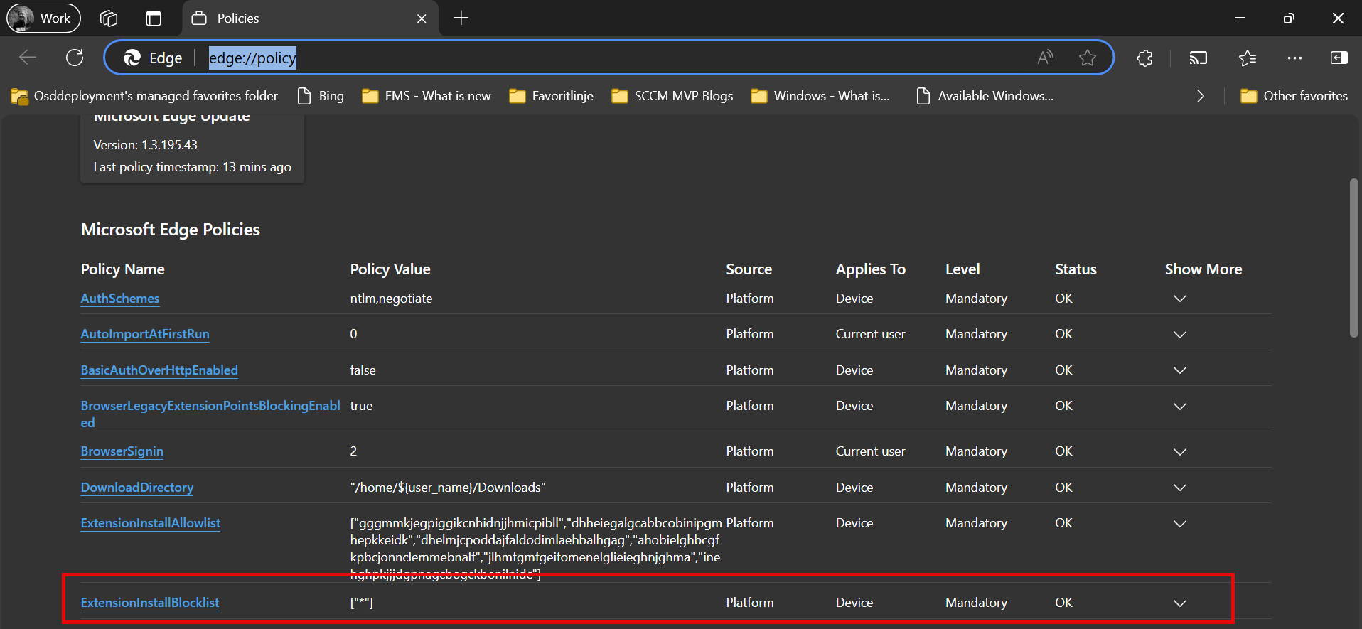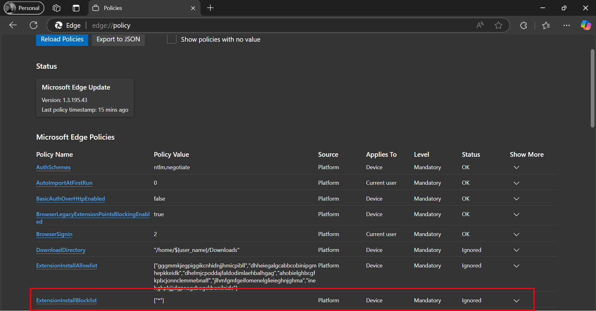 Lets check what the policy are saying now by entering edge://policy in your personal Edge profile