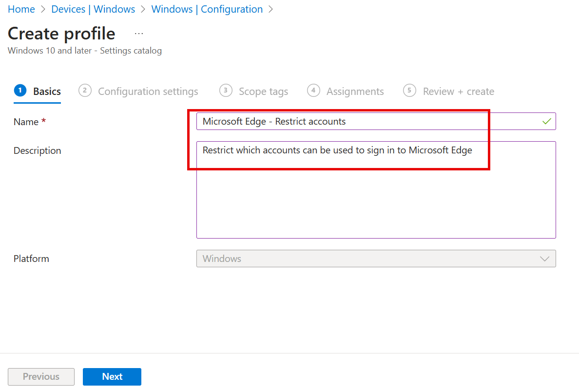 Enter name Microsoft Edge – Restrict accounts enter Description Restrict which accounts can be used to sign in to Microsoft Edge