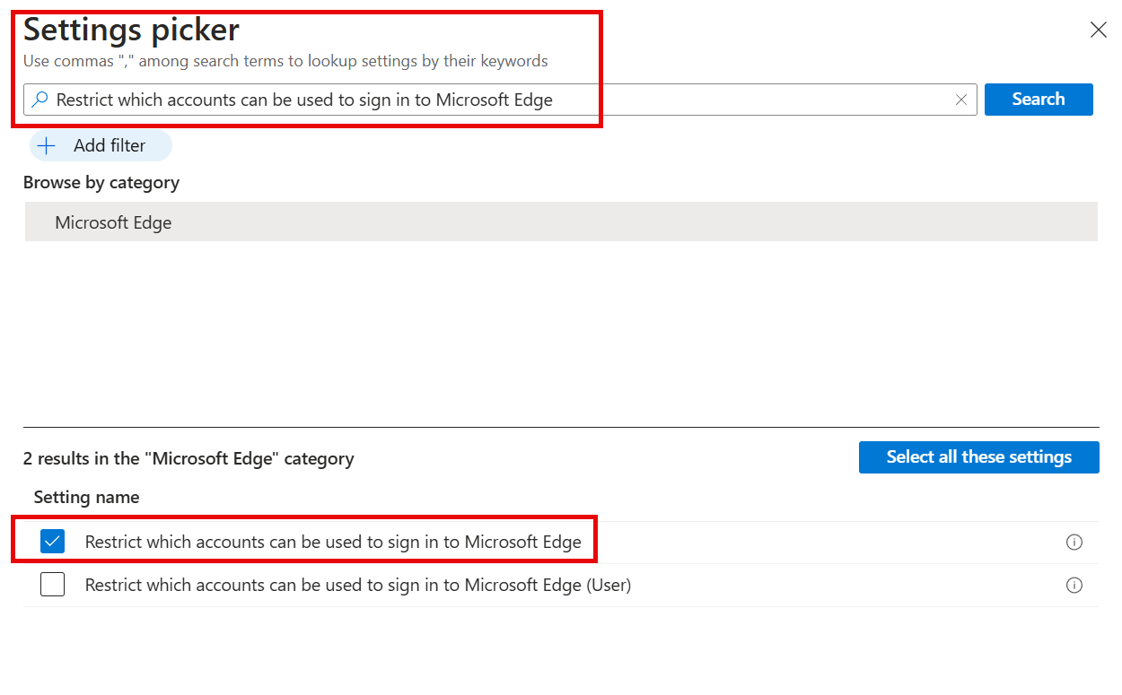 Search for Restrict which accounts can be used to sign in to Microsoft Edge and select Restrict which accounts can be used to sign in to Microsoft Edge