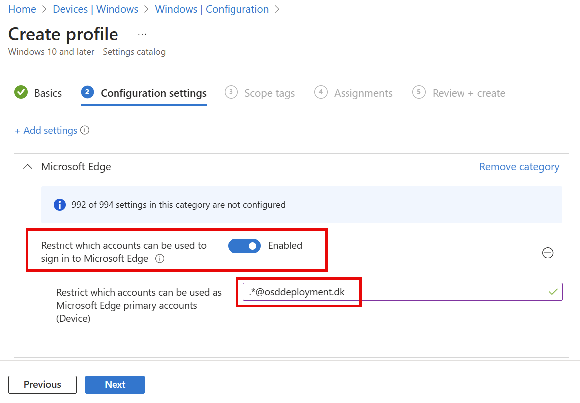 You need to Enable the policy settings and to put in which Entra domain name can be used in Microsoft Edge, in my case I enter .*@osddeployment.dk in Restrict which accounts can be used as Microsoft Edge primary accounts (Device)