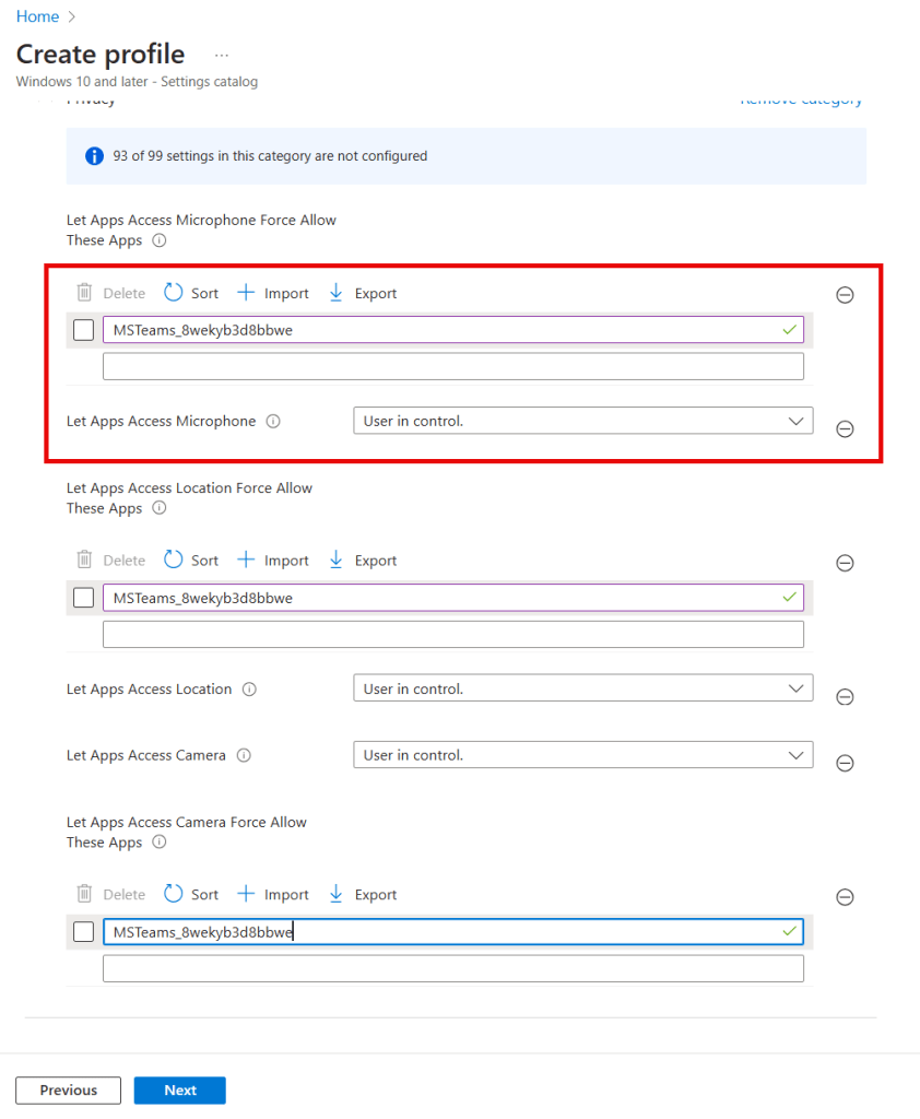 Keep Let Apps Access Camera, Let Apps Access Location and Let Apps Access Microphone configured to User in Control. If you want complete control over the settings on your end users’ devices, configure them to what you need.