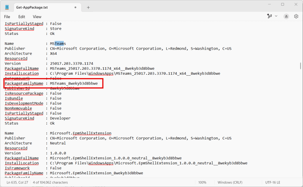 First I need to find the PackageFamilyName. I do that by getting the information from a device. This device should have Microsoft Teams already installed.