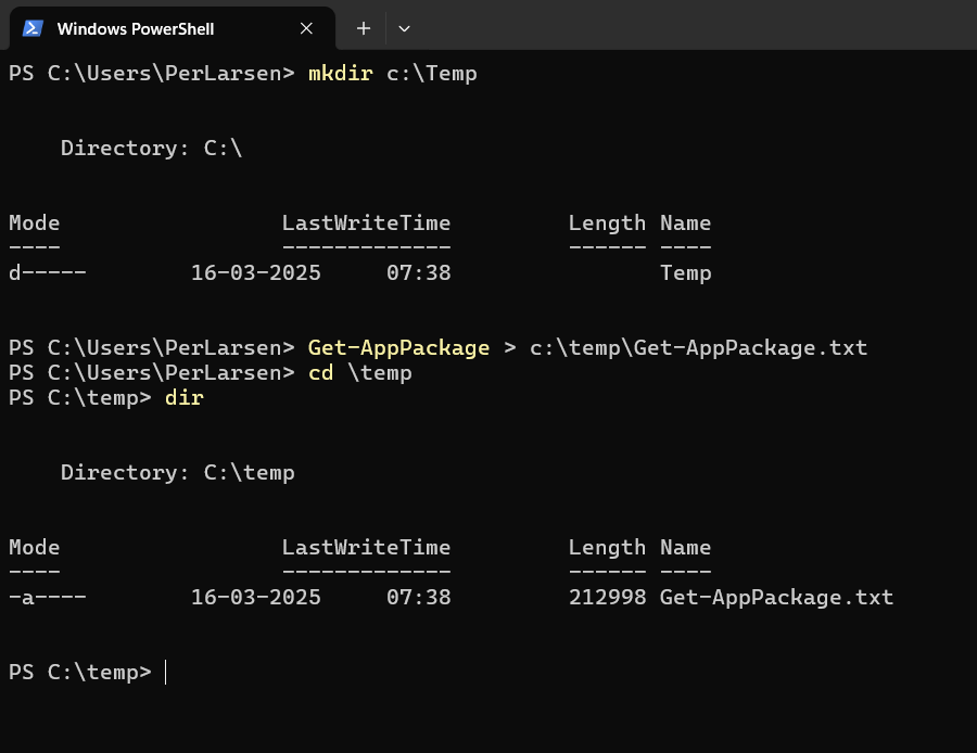 run the command Get-AppPackage > c:\temp\Get-AppPackages.txt