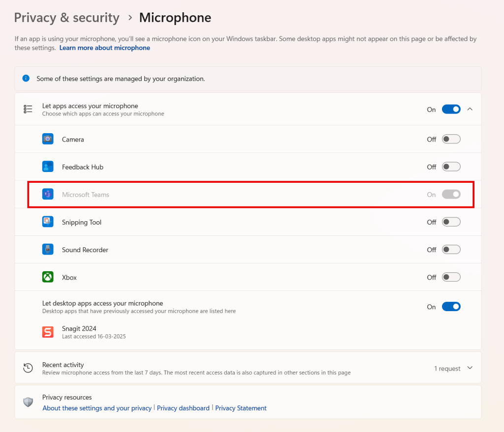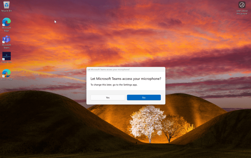 Microsoft Teams are set to allow microphone use. The rest of the settings are left for the end user to change themselves.